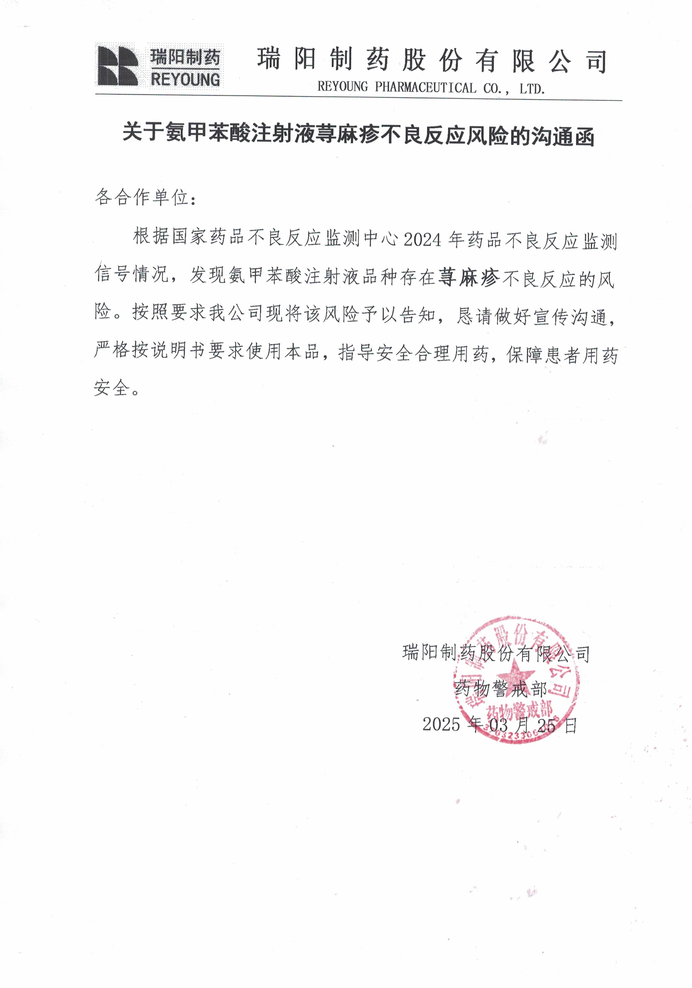 關于氨甲苯酸注射液蕁麻疹藥品不良反應風險的溝通函.jpg